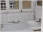 weiße Fliesen mit leicht roter Strutur, Wanne mit Dusche, Waschbecken, Fussbodenheizung. Fenster müssen mit Gardine oder Folie mit Sichtschutz ausgestattet werden