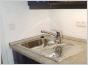 Komplett mit ALNO Küche Fronten in POP BLAU und Arbeitsfläche Trumalingrau ausgestattet, Stellplatz für Waschmaschine (Anschluss vorhanden), Herd mit Ceranfeld, Seiten inzwischen mit Alu verkleidet (nicht auf Foto), hoher Kühlschrank, weiß / rote Fliesen diagonal verlegt, durchgängig vom Flur, Fussbodenheizung